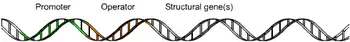In genetics, an operon is a functioning unit of DNA containing a cluster of genes under the control of a single promoter.[1] The genes are transcribed together into an mRNA strand and either translated together in the cytoplasm, or undergo splicing to create monocistronic mRNAs that are translated separately, i.e. several strands of mRNA that each encode a single gene product. The result of this is that the genes contained in the operon are either expressed together or not at all. Several genes must be co-transcribed to define an operon.[2]
