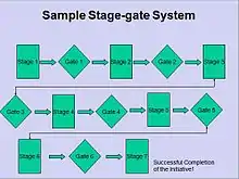 The stage-gate process was created because the traditional organisational structure is primarily for top-down, centralized control and communications, all of which are not practical for organizations that use project management and horizontal workflow. The stage-gate process evolved into life-cycle phases.[17] Stages are phases of the decision-making process where development work is completed. Phase–gate systems divide the innovation process into a predetermined set of stages composed of a group of "prescribed, related, and often parallel activities." Most Phase–gate systems involve four to seven stages.[18] Since each proceeding stage is more expensive than the previous, it is imperative that a high degree of research-backed discrimination is involved in passing stages. The body of research collected for proposed initiatives should be frequently consulted to adequately support the decision-making processes.