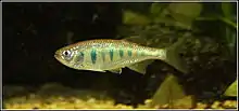 Species of the genus Opsarius have widely cleft mouths resemblant of carp. Additionally, Opsarius species will have a slender body usually marked by transverse stripes or spots. The dorsal fins of Opsarius are spineless and small.[6] One of the largest Opsarius species is Opsarius tileo which grows to 15 cm in length.[7]