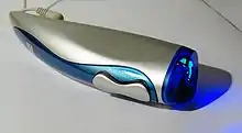 A laser mouse uses an infrared laser diode instead of an LED to illuminate the surface beneath their sensor. As early as 1998, Sun Microsystems provided a laser mouse with their Sun SPARCstation servers and workstations.[18] However, laser mice did not enter the mainstream consumer market until 2004, following the development by a team at Agilent Laboratories, Palo Alto, led by Doug Baney of a laser-based mouse based on a 850 nm VCSEL that offered a 20X improvement in tracking performance. Tong Xie, Marshall T. Depue, and Douglas M. Baney were awarded US patents 7,116,427 and 7,321,359 for their work on low power consumption broad navigability VCSEL-based consumer mice. Paul Machin at Logitech, in partnership with Agilent Technologies introduced the new technology as the MX 1000 laser mouse. This mouse uses a small infrared laser (VCSEL) instead of an LED and significantly increased the resolution of the image taken by the mouse. The laser illumination enabled superior surface tracking compared to LED-illuminated optical mice.[19]