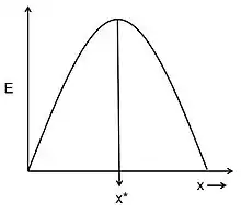 Given the hypotheses about the currency and the constraints, the optimal decision rule is the model's prediction of what the animal's best foraging strategy should be.[2] Possible examples of optimal decision rules could be the optimal number of food items that an animal should carry back to its nesting site or the optimal size of a food item that an animal should feed on. Figure 1, shows an example of how an optimal decision rule could be determined from a graphical model.[6] The curve represents the energy gain per cost (E) for adopting foraging strategy x. Energy gain per cost is the currency being optimized. The constraints of the system determine the shape of this curve. The optimal decision rule (x*) is the strategy for which the currency, energy gain per costs, is the greatest. Optimal foraging models can look very different and become very complex, depending on the nature of the currency and the number of constraints considered. However, the general principles of currency, constraints, and optimal decision rule remain the same for all models.