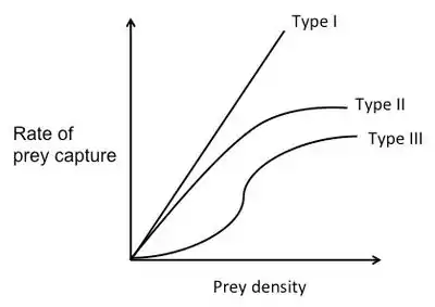 As previously mentioned, the amount of time it takes to search for a prey item depends on the density of the prey. Functional response curves show the rate of prey capture as a function of food density and can be used in conjunction with the optimal diet theory to predict foraging behavior of predators. There are three different types of functional response curves.[13]
