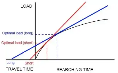 Kacelnik et al. wanted to determine if this species does indeed optimize net energy gain per unit time as hypothesized.[17] They designed an experiment in which the starlings were trained to collect mealworms from an artificial feeder at different distances from the nest. The researchers artificially generated a fixed curve of diminishing returns for the birds by dropping mealworms at successively longer and longer intervals. The birds continued to collect mealworms as they were presented, until they reached an "optimal" load and flew home. As Figure 5 shows, if the starlings were maximizing net energy gain per unit time, a short travel time would predict a small optimal load and a long travel time would predict a larger optimal load. In agreement with these predictions, Kacelnik found that the longer the distance between the nest and the artificial feeder, the larger the load size. In addition, the observed load sizes quantitatively corresponded very closely to the model's predictions. Other models based on different currencies, such as energy gained per energy spent (i.e. energy efficiency), failed to predict the observed load sizes as accurately. Thus, Kacelnik concluded that starlings maximize net energy gain per unit time. This conclusion was not disproved in later experiments.[18][19]