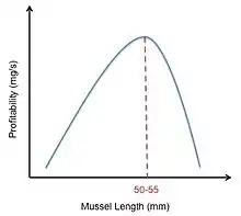 Oystercatcher mussel feeding provides an example of how the optimal diet model can be utilized. Oystercatchers forage on mussels and crack them open with their bills. The constraints on these birds are the characteristics of the different mussel sizes. While large mussels provide more energy than small mussels, large mussels are harder to crack open due to their thicker shells. This means that while large mussels have a higher energy content (E), they also have a longer handling time (h). The profitability of any mussel is calculated as E/h. The oystercatchers must decide which mussel size will provide enough nutrition to outweigh the cost and energy required to open it.[2] In their study, Meire and Ervynck tried to model this decision by graphing the relative profitabilities of different sized mussels. They came up with a bell-shaped curve, indicating that moderately sized mussels were the most profitable. However, they observed that if an oystercatcher rejected too many small mussels, the time it took to search for the next suitable mussel greatly increased. This observation shifted their bell-curve to the right (Figure 4). However, while this model predicted that oystercatchers should prefer mussels of 50–55 mm, the observed data showed that oystercatchers actually prefer mussels of 30–45 mm. Meire and Ervynk then realized the preference of mussel size did not depend only on the profitability of the prey, but also on the prey density. After this was accounted for, they found a good agreement between the model's prediction and the observed data.[16]