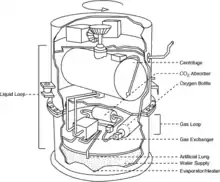 The flight hardware unit, the FOEP, was a pressure-tight canister containing a water-filled centrifuge that housed the two frogs. The centrifuge was a cylindrical structure that rotated the frogs' heads at scheduled intervals.[3] The FOEP also contained a life support system which could maintain a regulated environment for the frogs. This system consisted of two closed loops, one containing liquid and the other containing gas. The interface between the two loops was a selectively permeable silicone rubber that acted as an artificial lung. Oxygen passed through the membrane from the gas to the liquid side, and carbon dioxide from the liquid to the gas side. The frogs were immersed in the liquid loop. A pump circulated oxygen through the gas-containing loop. Carbon dioxide entering the gas loop was removed by an absorbent and the purified oxygen returned to the pump for recirculation. A water evaporator and an electric heater maintained the water temperature at about 60 °F (16 °C). An amplifier system in the FOEP increased voltage output from the microelectrodes implanted in the animals to the level required by the telemetry apparatus.