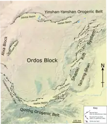 The Ordos Block is a crustal block, that forms part of the larger North China Block (NCB). It is surrounded by active fault systems and has been a distinct block since at least the Mesozoic. It is bordered to the west by the Alxa Block, the westernmost part of the NCB, to the south by the Qinling orogenic belt, to the north by the Yanshan-Yinshan orogenic belt, part of the Central Asian Orogenic Belt and to the east by the Taihangshan mountain range, which forms part of the Trans-North China Orogen.[1] The block is currently stable and large earthquakes are restricted to the bordering fault zones. It has been suggested that the block is currently undergoing anti-clockwise rotation with respect to the Eurasian Plate, as a result of the ongoing eastward spreading of the Tibetan Plateau,[2] although this view has been challenged.[3]