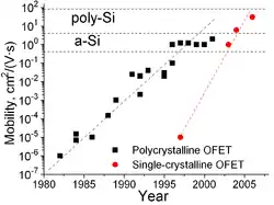 The most important parameter of OFET carrier transport is carrier mobility. Its evolution over the years of OFET research is shown in the graph for polycrystalline and single crystalline OFETs. The horizontal lines indicate the comparison guides to the main OFET competitors – amorphous (a-Si) and polycrystalline silicon. The graph reveals that the mobility in polycrystalline OFETs is comparable to that of a-Si whereas mobility in rubrene-based OFETs (20–40 cm2/(V·s)) approaches that of best poly-silicon devices.[16]