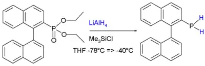 Primary (1°) phosphines, with the formula RPH2, are typically prepared by alkylation of phosphine. Simple alkyl derivatives such as methylphosphine (CH3PH2) are prepared by alkylation of alkali metal derivatives MPH2 (M is Li, Na, or K). Another synthetic route involves treatment of the corresponding chlorophosphines with hydride reagents. For example, reduction of dichlorophenylphosphine with lithium aluminium hydride affords phenylphosphine (PhPH2).[4]
