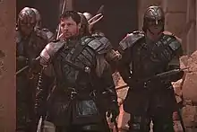 The Ori warriors are conscripted men, who were trained to fight non-believers as foot soldiers and take over the Milky Way. Introduced in "Crusade," they are shown wearing metallic plate armor and armed with powerful staff weapons. They are first seen in combat in Season 10.[4] Cooper wrote "Crusade" with the intention to show that the Ori warriors are not two-dimensional, even though their strength of belief and single-mindedness makes them fight for what they want to fight for.[4] According to Cooper, the Ori warriors are a fictional mirror of the events in the real world, but he wanted people to try and understand "why people want to go to war with us, or blow up our buildings, or our airplanes."[4] Cooper also wanted to show that "there's really no winner to the argument" when it comes to "religion and belief, and gods;" according to Cooper, there is a line when a society takes up arms instead of finding a more civilized way of dialogue.[4]