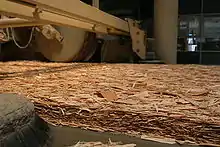 The layers are created by shredding the wood into strips, which are sifted and then oriented on a belt or wire-mesh caul (a heated, ventilated support) and coated with the resin.[5] The layers thus built up are transferred to a forming line and cross-orientated so that strips on the external layers are aligned to the panel's strength axis, while the internal layers are perpendicular.[6] The number of layers placed is determined partly by the thickness of the panel, but is limited by the equipment installed at the manufacturing site. Individual layers can also vary in thickness to give different finished panel thicknesses (typically, a 15 cm (5.9 in) layer will produce a 15 mm (0.59 in) panel thickness). The mat is placed in a thermal press to compress the flakes and bond them by heat activation and curing of the resin that has been coated on the flakes. Individual panels are then cut from the mats into finished sizes. Most of the world's OSB is made in the United States and Canada in large production facilities.