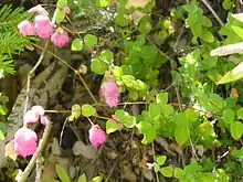 Origanium libanoticum is a small perennial, growing to 20–30 cm (8–12 in) tall by 30–45 cm (12–18 in) wide. It with fragrant leaves, and pink, hop-like flowering bracts blooming between July and September. Overlapping pink to pale green hop-like bracts droop from the ends of wiry stems, hence the common name of hopflower oregano. Small rose-pink flowers stem from under the bracts.[5] By the end of the flowering season, the flowers dry out and become papery and brown.[3] The 1-1.5 cm leaves are ovate and obtuse; they are fragrant but not as aromatic as other oregano species.[5]