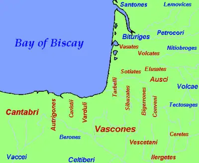 However, the Vascones appear to have been just one tribe within a wider language community. Across the border in what is now France, the Aquitanian tribes of Gascony spoke a language different from the Celts and were more like the Iberi.[41] Although no complete inscription in their language survives, a number of personal names were recorded in Latin inscriptions, which attest to Aquitanian being the precursor of modern Basque[42] (this extinct Aquitanian language should not be confused with Occitan, a Romance language spoken in Aquitaine since the beginning of the Middle Ages).