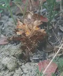 Orobanche parishii is a species of broomrape known by the common names Parish's broomrape[1] and short-lobed broomrape. It is native to the coast and mountains of California and Baja California, where it is a parasite growing attached to the roots of other plants, usually shrubs of the Asteraceae, such as Menzies' goldenbush (Isocoma menziesii). This plant produces usually one thick, hairy, glandular, pale yellowish stem up to about 26 centimetres (10 in) tall. As a parasite taking its nutrients from a host plant, it lacks leaves and chlorophyll. The inflorescence is a dense cluster of flowers accompanied by dark-veined oval bracts. Each flower has a calyx of triangular sepals and a tubular corolla roughly 2 centimetres (0.8 in) long, pale brownish or pinkish in color with red veining.