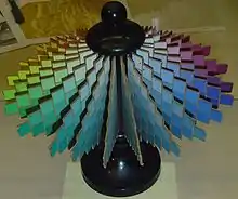 Ostwald's first Color Harmony Manual was a set of 12 handbooks showing complementary hues. The first edition was published in 1942. It contained 680 color chips. Each color chip was a 5/8 inch square and had a tab where the Ostwald notation was written.[2]