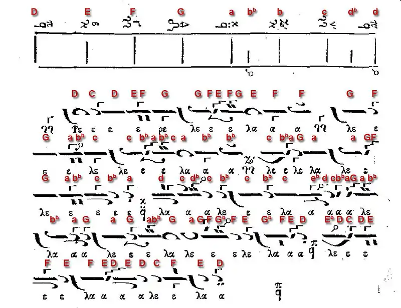 One of the most notable composers of "new synthesis" Ottoman classical music is Kasımpaşalı Osman Effendi, whose focus, along with his students, was on reviving the tradition of complex rhythmic cycles, which he had correctly identified as lost, unlike many court musicologists of his time.[10] These new rhythmic cycles were later used by his student Hafız Post to fit the more folkloric, popular poetry form murabba, bridging the gap between older Persian classical works and newer Anatolian ones, created after the decline of Persian music in the 16th century.[10] Meanwhile, other students of Osman Effendi, such as Mustafa Itri, sought out the conventions of Byzantine music, incorporating the concepts of the Orthodox tradition into his works as well as his treatises. This significantly bolstered the exchange between Byzantine and Ottoman music, and the resulting era featured a number of Greek composers, most notably Peter Peloponnesios, Hanende Zacharia and Tanburi Angeli.[10][13] Increasingly, modal structures between the two traditions began to converge as well, as manuscripts often recorded both echoi and makams of composed pieces. A piece during this time might have been recorded as "Segâh makam, usûl muhammes, echos IV legetos", noting similarities and equivalences between the two systems.[16]