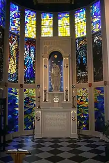 A new St Peter-in-Chains was opened by Cardinal Heenan on Palm Sunday 1973 and the shrine transferred to the new church.[5] The statue of Our Lady of Doncaster now stands in a circular shrine chapel on the north side of the church. Phyffers' statue stands in an oak reredos with modern stained glass windows depicting St Joseph, the Annunciation, the Nativity and the Assumption.