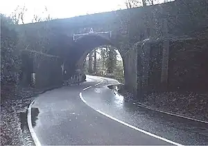 There is still much to be seen of the line between Haywards Heath and Uckfield. Skew Bridge across Borde Hill Lane between Haywards Heath and Balcombe (TQ 325 273) has extended abutments where the railway would have passed over the road. Each side of the road at Borde Hill (TQ 325 273) embankments survive, with a remnant of the bridge abutment on the southern side, visible from Copyhold Lane. A cutting leads to what would have been a tunnel at Kenwards Farm (TQ 325 273). In Lindfield an embankment at TQ 348 264 survives. Lindfield station would have been at TQ 351 261 with recently found remains of a brick-making kiln in what would have been the station yard. Near Sharp's Bridge there are the beginnings of cuttings either side of Buckham Hill where there would have been a short tunnel and south of Uckfield, an embankment and the only other completed bridge (TQ 456 205). Although reported as destroyed during the construction of the Uckfield Bypass in the 1990s, the bridge is still in position although in decrepit state, visited but not photographed September 2009.[3] In April 2009, about a mile south-west of Uckfield there were two sections of embankments and cuttings, at (TQ 456 205 - TQ 452 207) and (TQ 451 208 - TQ 447 209). The remains of one bridge abutment were visible adjacent to a footpath at TQ 456 205.