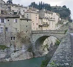 The Ouvèze (French pronunciation: [uvɛz]; Occitan: Ovesa) is a river in southern France and left tributary of the Rhône.[1] It rises in the southern French Prealps (the Baronnies), in the commune of Montauban-sur-l'Ouvèze. It flows into the Rhône in Sorgues, north of Avignon. Its length is 93 km (58 mi).[1] Its drainage basin is 1,919 km2 (741 sq mi).[2] The Sorgue is one of its tributaries.