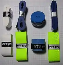 An overgrip (also known as an overwrap) is a soft, padded, clothlike tape wrapped around the grip of a racquet, and are commonly used in the sport of tennis, badminton, squash, and pickleball. The purposes of an overgrip include (but are not limited to) increasing the racquet handle's circumference, customizing the texture and feel of the handle, adding padding/cushioning for more comfort, or for cosmetic purposes (many overgrips have multiple color and pattern options). There are generally two categories of overgrips: Tacky grips help increase the tackiness (stickiness) of the racquet handle to allow for a better grip and minimize slipping, while absorbent overgrips are designed to absorb the sweat that comes off of a player's palms.