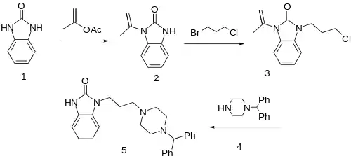 Reaction of 2-Benzimidazolinone with isopropenyl acetate leads to the singly protected imidazolone derivative (2). Alkylation of this with 3-chloro-1-bromopropane affords the functionalized derivative (3). Alkylation of the monobenzhydryl derivative of piperazine (4) with 3 gives oxatomide (5), after hydrolytic removal of the protecting group.