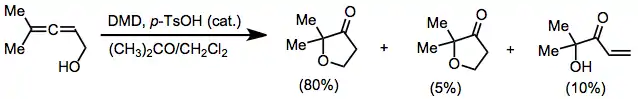 Dioxiranes oxidize primary alcohols to either the aldehyde or carboxylic acid;[18] however, DMD selectively oxidizes secondary over primary alcohols. Thus, vicinal diols may be transformed into α-hydroxy ketones with dioxirane oxidation.[19]