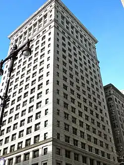 Oxide jacking damaged the terra cotta cornice on the Land Title Building in Philadelphia, designed in 1897 and expanded in 1902 by pioneer skyscraper architect Daniel Burnham.[6] The Land Title complex, with its two interconnected towers, is on the National Register of Historic Places. By 1922, experts on architectural terra cotta were warning that the rusting of embedded iron fasteners could cause decorative building components to fail.[7] This 1902 cornice is nearly 9 feet (2.7 m) high, projects 7 feet (2.1 m) from the facade of the building and is 465 feet (142 m) long. The cornice was stabilized, steel anchors subject to rusting were replaced with new stainless steel anchors, and the cornice was completely renovated. The project was completed in 1991.[6]