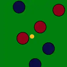 In pétanque the objective is to score points by having boules closer to the target than the opponent after all boules have been thrown. This is achieved by throwing or rolling boules closer to the small target ball, officially called a jack[2] (fr: cochonnet),[3] or by hitting the opponents' boules away from the target, while standing inside a circle with both feet on the ground.