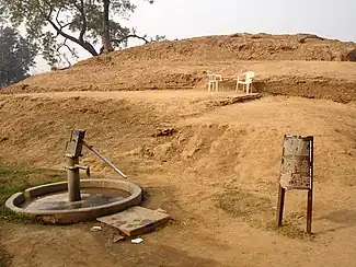 When the Buddha reached his eightieth year, he felt that his time in this world was approaching an end. At that time, according to the Mahāparinibbāṇa Sutta (Sutta 16 of the Dīgha Nikāya), he and some of his disciples undertook a months-long journey that would take them from Rājagṛha, through Pāṭaliputta, Vesāli, Bhoganagara, and Pāvā, to their final destination at Kuśinagara.[6] It was at Pāvā that Cunda, a resident of Pāvā, invited the group to a meal that featured a food called sukaramaddava. This would prove to be the Buddha's last meal, as he was afflicted by a painful illness resembling dysentery soon after consuming the meal.[7] It was on this occasion that the Cunda Sutta (AN 6:46) was preached.[8] At that time, the Mallas had just completed their new meeting hall. Upon their invitation, the Buddha consecrated it by first occupying it and then preaching in it. After the Buddha had finished speaking, one of his leading disciples, Śāriputra, recited the Saṅgīti Sutta (DN 33) to the assembled monks. After the meal, the Buddha crossed the Kakkuttha River (now called the Khanua River) and completed his journey to Kushinagar.[9] Soon after his arrival in Kushinagar, the Buddha attained parinirvana. After the Buddha's cremation, the Mallas of Pāvā claimed a share in his relics. A Brahmin named Drona satisfied their claim, and a stupa was erected in Pāvā over their share of the relics.[10]