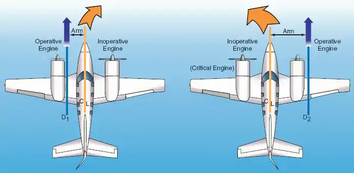 For multi-engine aircraft with counter-rotating propellers, the P-factors of both engines will cancel out. However, if both engines rotate in the same direction, or if one engine fails, P-factor will cause a yaw. As with single-engine aircraft, this effect is greatest in situations where the aircraft is at high power and has a high angle of attack (such as the climb). The engine with the down-moving blades towards the wingtip produces more yaw and roll than the other engine, because the moment (arm) of that engine's center of thrust about the aircraft center of gravity is greater. Thus, the engine with down-moving blades closer to the fuselage will be the "critical engine", because its failure and the associated reliance on the other engine will require a significantly larger rudder deflection by the pilot to maintain straight flight than if the other engine had failed. P-Factor therefore determines which engine is critical engine.[6] For most aircraft (which have clockwise rotating propellers), the left engine is the critical engine. For aircraft with counter-rotating propellers (i.e. not rotating in the same direction) the P-factor moments are equal and both engines are considered equally critical.