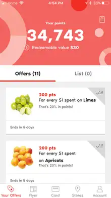 Points can be redeemed for free groceries or other rewards. Points may be redeemed once a customer has reached a total of 10,000 or more (1,000 points = CA$1).[27] Customers must also have a second form of payment once points are redeemed (as customers can only use points in multiples of 10,000) if they don't want to overspend their points. Points can not be redeemed for gift cards, alcohol,[28] tobacco, lottery tickets, or prescription medication.[29]