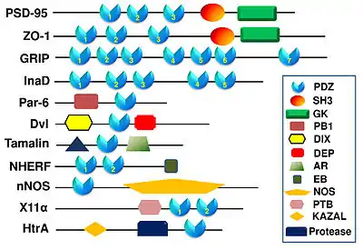 The first discovered function of the PDZ domains was to anchor receptor proteins in the membrane to cytoskeletal components. PDZ domains also have regulatory functions on different signaling pathways.[13] Any protein may have one or several PDZ domains, which can be identical or unique (see figure to right). This variety allows these proteins to be very versatile in their interactions. Different PDZ domains in the same protein can have different roles, each binding a different part of the target protein or a different protein altogether.[14]