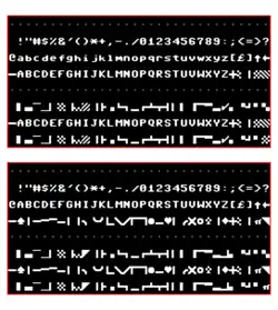 The character set was largely designed by Leonard Tramiel (the son of Commodore CEO Jack Tramiel) and PET designer Chuck Peddle. The graphic characters of PETSCII were one of the extensions Commodore specified for Commodore BASIC when laying out desired changes to Microsoft's existing 6502 BASIC to Microsoft's Ric Weiland in 1977.[1] The VIC-20 used the same pixel-for-pixel font as the PET, although the characters appeared wider due to the VIC's 22-column screen. The Commodore 64, however, used a slightly re-designed, heavy upper-case font, essentially a thicker version of the PET's, in order to avoid color artifacts created by the machine's higher resolution screen. The C64's lowercase characters are identical to the lowercase characters in the Atari 800's system font (released several years earlier).