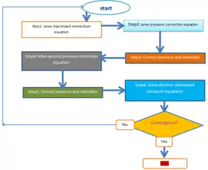 PISO algorithm (Pressure-Implicit with Splitting of Operators) was proposed by Issa in 1986 without iterations and with large time steps and a lesser computing effort. It is an extension of the SIMPLE algorithm used in computational fluid dynamics to solve the Navier-Stokes equations. PISO is a pressure-velocity calculation procedure for the Navier-Stokes equations developed originally for non-iterative computation of unsteady compressible flow, but it has been adapted successfully to steady-state problems.