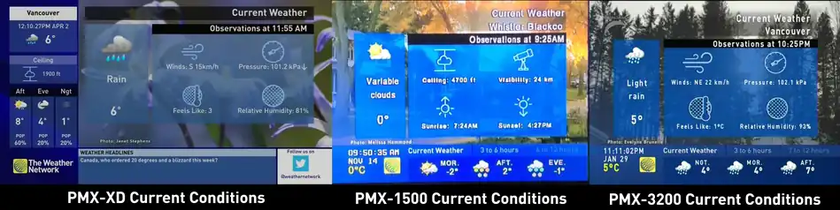 PMX refers to the technology developed by Pelmorex to generate local weather information on The Weather Network. PMX consists of computers, typically installed at a cable headend, that takes data fed to it (the video feed of The Weather Network, forecast information, and triggers to run said forecasts) and packages it for broadcast. Unlike the Weather Star systems, it does not generate full graphical or video segments, rather the information is super-imposed over the main video feed. There are 4 different PMX units: PMX-1500, PMX-3200, PMX-NG and PMX-XD.[1]