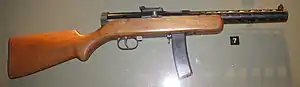 The PPD (Pistolet-Pulemyot Degtyaryova, Russian: Пистоле́т-пулемёт Дегтярёва, Degtyaryov's machine pistol) is a submachine gun originally designed in 1934 by Vasily Degtyaryov. The PPD had a conventional wooden stock, fired from an open bolt, and was capable of selective fire. It was replaced by the PPSh-41.