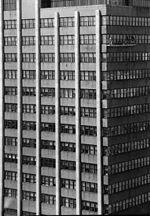 The design of the PSFS Building elicited both early criticism and praise. In the March 1931 issue of T-Square Club Journal Elbert Conover said, "The day will come when even in America, we will become skillful enough to meet economic pressure without forcing upon the community such ugliness and illogical designing."[34] The PSFS Building was one of only two U.S. skyscrapers included in the 1932 International style exhibition at the Museum of Modern Art. Run by Henry-Russell Hitchcock and Philip Johnson, the exhibition was where the term International style was coined.[8] The PSFS Building was praised for its cantilevering facade and the building's organization of shops on the first floor, the banking hall on the second floor, offices above and the service tower in the back. Unlike the PSFS Building, the design of the other skyscraper—New York City's McGraw-Hill Building—was more due to necessity of publishing operations and zoning restrictions than following an architectural movement. Hitchcock and Johnson were critical of both building's use of ornamental signage at the top.[35] However, Lescaze and Howe's design was not featured at the 1932 Architectural League of New York Annual Exhibition after the skyscraper was deemed as having an ugly and illogical design. Howe responded by saying "Like all institutions which have become traditional, it tends to resent change."[34]