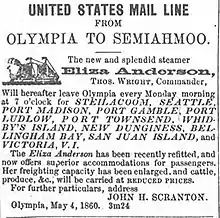 In the early 1860s, there was no telegraph in Puget Sound, and mail carried by steamboat was the fastest way of transmitting news. Thus, on November 27, 1860, the Anderson brought to Port Townsend news that Abraham Lincoln had been elected president of the United States on November 4, 1860, even though the news had reached Olympia on November 22.[11]