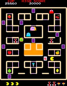 Assisting Pac-Man is the titular "Pal" character Miru, a green-colored creature with a pink bow. Whenever any items are unlocked, Miru will try to pick one up and carry it toward the center box; if Pac-Man does not catch up to her and eat the item before she enters the box, it disappears.[2] Once all the items are gone, the level ends and the player earns bonus points for each item eaten, receiving a larger bonus for preventing Miru from taking any of them into the box.[2] An orange area immediately below the center box causes the ghosts to slow down whenever they are inside and obscures both them and Pac-Man, leaving only the ghosts' eyes visible.[1] The third level and every fourth level thereafter is a bonus stage with 10 cards and no ghosts; one card shows Miru, one shows the ghost Blinky, and the other eight have dollar signs. Points are awarded for each card flipped, and Miru's card doubles the total. The stage ends immediately if Blinky is found, but the player earns a larger bonus for finding him last.[1] The player loses one life whenever Pac-Man touches a non-stunned ghost, but can safely run through Miru at any time. When all lives are lost, the game ends.