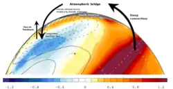 ENSO can influence the global circulation pattern thousands of kilometers away from the equatorial Pacific through the "atmospheric bridge". During El Niño events, deep convection and heat transfer to the troposphere is enhanced over the anomalously warm sea surface temperature, this ENSO-related tropical forcing generates Rossby waves that propagate poleward and eastward and are subsequently refracted back from the pole to the tropics. The planetary waves form at preferred locations both in the North and South Pacific Ocean, and the teleconnection pattern is established within 2–6 weeks.[9] ENSO driven patterns modify surface temperature, humidity, wind, and the distribution of clouds over the North Pacific that alter surface heat, momentum, and freshwater fluxes and thus induce sea surface temperature, salinity, and mixed layer depth (MLD) anomalies.