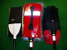 A paddle float may be used for reentry into a kayak after a capsize in open water.[1] It may also be used for a reentry and roll, or for training a kayak roll. There are two main variants of paddle floats; the inflatable variant and foam variant. The inflatable variant is more popular, but needs to be inflated before use. Alternatively, one can use the foam variant, which usually has less buoyancy, but may be easier to handle in cold conditions. In an emergency, it is also possible to use a life jacket as an improvised paddle float.[2]