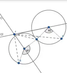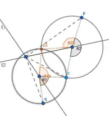 Illustration of Paden–Kahan Subproblem 2. The subproblem yields two solutions in the event that the circles intersect at two points; one solution if the circles are tangential; and no solution if the circles fail to intersect.