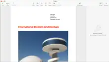 Each document window contains a toolbar, which gives one-click access to commonly used functions such as inserting objects (text boxes, shapes, tables, charts, and comments), uploading the document to iWork.com, and adding additional pages. In addition, the document window contains a contextual format bar that allows one-click formatting of text and adjustments to images. When text is selected, the format bar enables users to choose fonts, text size, and color, and to adjust line spacing and alignment. When an image is selected, the format bar displays tools to adjust opacity, show and hide shadow and reflection effects and mask the image.[9] A separate Inspector window provides almost all formatting options available for any element in the open document.