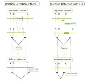 - DNA-PET: Because PET represent connectivity between the tags, the use of PET in genome re-sequencing has advantages over the use of single reads. This application is called pairwise end sequencing, known colloquially as double-barrel shotgun sequencing. Anchoring one half of the pair uniquely to a single location in the genome allows mapping of the other half that is ambiguous. Ambiguous reads are those that map to more than a single location. This increased efficiency reduces the cost of sequencing as these ambiguous sequences, or reads, would normally be discarded. The connectivity of PET sequences also allows detection of structural variations: insertions, deletions, duplications, inversions, translocations.[1][4] During the construction of the PET library, the fragments can be selected to all be of a certain size. After mapping, the PET sequences are thus expected to be consistently a particular distance away from each other. A discrepancy from this distance indicates a structural variation between the PET sequences. For example (Figure on the right): a deletion in the sequenced genome will have reads that map further away than expected in the reference genome as the reference genome will have a segment of DNA that is not present in the sequenced genome.