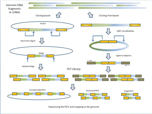 Fragmented genomic DNA or complementary DNA (cDNA) of interest is cloned into plasmid vectors. The cloning sites are flanked with adaptor sequences that contain restriction sites for endonucleases (discussed below). Inserts are ligated to the plasmid vectors and individual vectors are then transformed into E. coli making the PET library. PET sequences are obtained by purifying plasmid and digesting with specific endonuclease leaving two short sequences on the ends of the vectors. Under intramolecular (dilute) conditions, vectors are re-circularized and ligated, leaving only the ditags in the vector. The sequences unique to the clone are now paired together. Depending on the next-generation sequencing technique, PET sequences can be left singular, dimerized, or concatenated into long chains.[1]