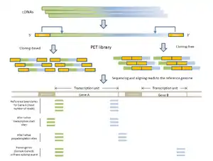 - RNA-PET: This application is used for studying the transcriptome: transcripts, gene structures, and gene expressions.[1][10] The PET library is generated using full length cDNAs, so the ditags represent the 5’ capped and the 3’ polyA tail signatures of individual transcripts. Therefore, RNA-PET is especially useful for demarcating the boundaries of transcription units. This will help identify alternative transcription start sites and polyadenylation sites of genes.[1] RNA-PET could also be used to detect fusion genes and trans-splicing, but further experiment is needed to distinguish between them.[11] Other methods of finding the boundaries of transcripts include the single-tag strategies CAGE, SAGE, and the most recent SuperSAGE, with the CAGE and 5’ SAGE defining the transcription start sites and the 3’ SAGE defining the polyadenylation sites.[1] The advantages of PET sequencing over these methods are that PET identify both ends of the transcripts and, at the same time, provide more specificity when mapping back to the genome. Sequencing the cDNAs can reveal the structures of transcripts in great details, but this approach is much more expensive than RNA-PET sequencing, especially for characterizing the whole transcriptome.[10] The major limitation of RNA-PET is the lack of information regarding the organization of the internal exons of transcripts. Therefore, RNA-PET is not suitable for detecting alternative splicing. In addition, if the cloning procedure is used construct the cDNA library before generating the PETs, cDNAs that are difficult to clone (as a result of long transcripts) would have lower coverage.[10] Similarly, transcripts (or transcript isoforms) with low expression levels would likely be under-represented as well.