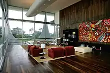 The State Room is furnished with a mixture of contemporary and antique items. The main wall is made of jacarandá-da-baía. Two sacred images stand out, Saint Mary Magdalene and Saint Teresa of Ávila, both from the 18th century Baroque style. Kennedy Bahia’s tapestry, entitled Flora e Fauna da Bahia, stands out on the wall, as well as paintings made by Djanira da Motta e Silva entitled Colhendo Café; by Maria Leontina, entitled Cena II; and by Alfredo Volpi entitled Fachada em Oval.[3]