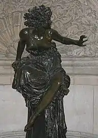 The bases of the two avant-corps are decorated (from left to right) with four major multi-figure groups sculpted by François Jouffroy (Poetry, also known as Harmony),[23] Jean-Baptiste Claude Eugène Guillaume (Instrumental Music), Jean-Baptiste Carpeaux (The Dance, criticised for indecency), and Jean-Joseph Perraud (Lyrical Drama). The façade also incorporates other work by Gumery, Alexandre Falguière, and others.[24]