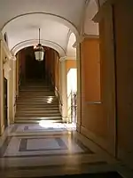 During and after its occupancy by the Stuart Family it has sometimes been referred to as the Palazzo Stuart. This is given further weight by the existence of a large plaque documenting the Stuart period of the palazzo. This tablet is situated in the corridor from the main entrance leading to the courtyard.