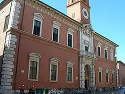 In the 15th century, the palace had only one floor. In 1567, the dukes converted the building to house university offices, and a second floor was added by Giovanni Battista Aleotti, who also relocated the facade to the via delle Scienze, where the portal was surmounted by a small clock tower, designed (1610) by Alessandro Balbi and Aleotti.