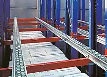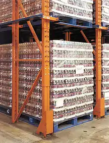 Pallet rack is a material handling storage aid system designed to store materials on pallets (or “skids”). Although there are many varieties of pallet racking, all types allow for the storage of palletized materials in horizontal rows with multiple levels. Forklift trucks are usually required to place the loaded pallets onto the racks for storage. Since the Second World War, pallet racks have become a ubiquitous element of most modern warehouses, manufacturing facilities, retail centers, and other storage and distribution facilities. All types of pallet racking increase storage density of the stored goods. Costs associated with the racking increases with increasing storage density.
